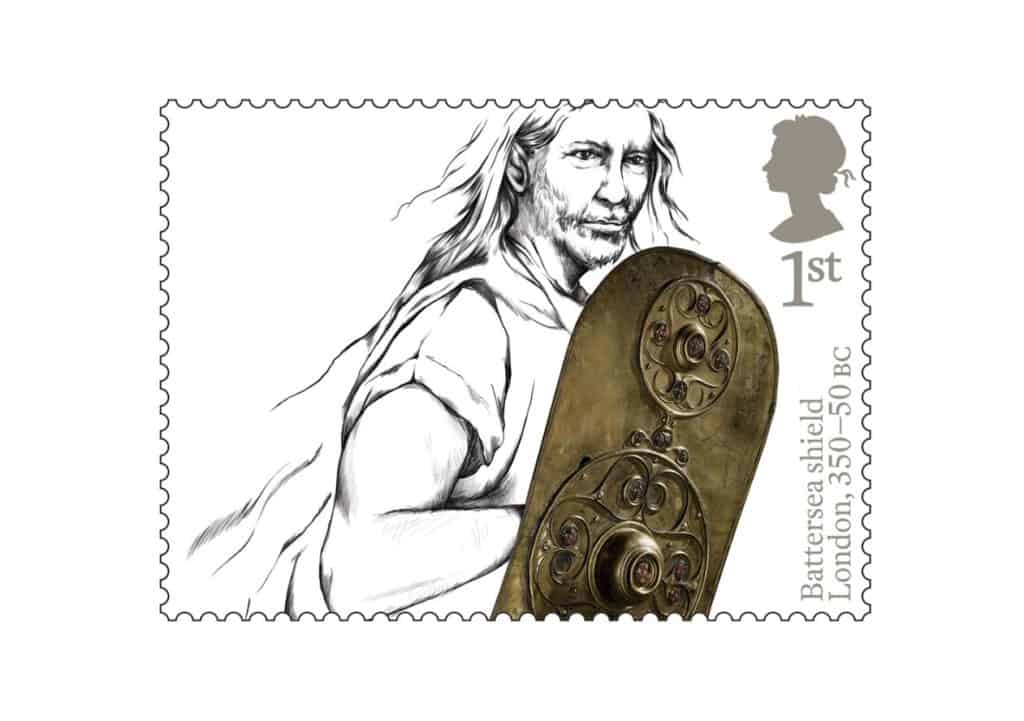 Featured on the stamps are: The Battersea Shield, The Star Carr Headdress, Skara Brae Village (Orkney Islands), Grime’s Graves Flint Mines, Avebury Stone Circles, The Mold Cape (Wales), The Drumbest Horns (Northern Ireland) and Maiden Castle Hill Fort.